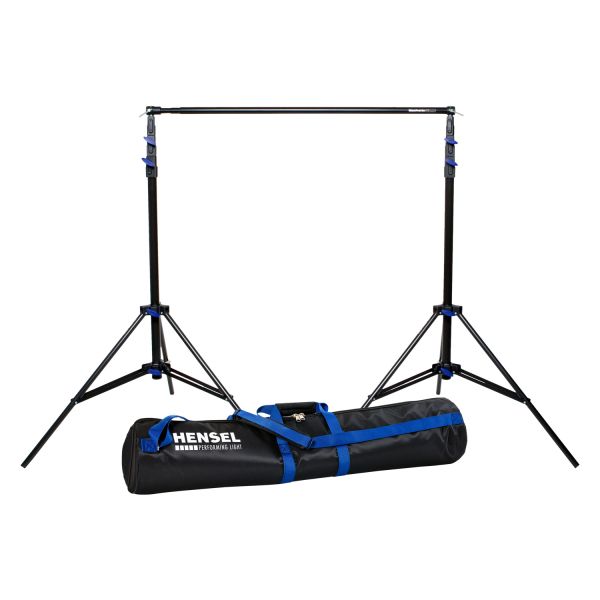 Die tragbare Hintergrundaufhängung mit zwei Alu-Stativen Hensel VI (Art. 223) und einer Teleskopstange 1,15 - 3,0 m (Art. 4101119), geliefert in einer Stativtasche (Art. 3750). Auch ideal für Stoffhintergründe.