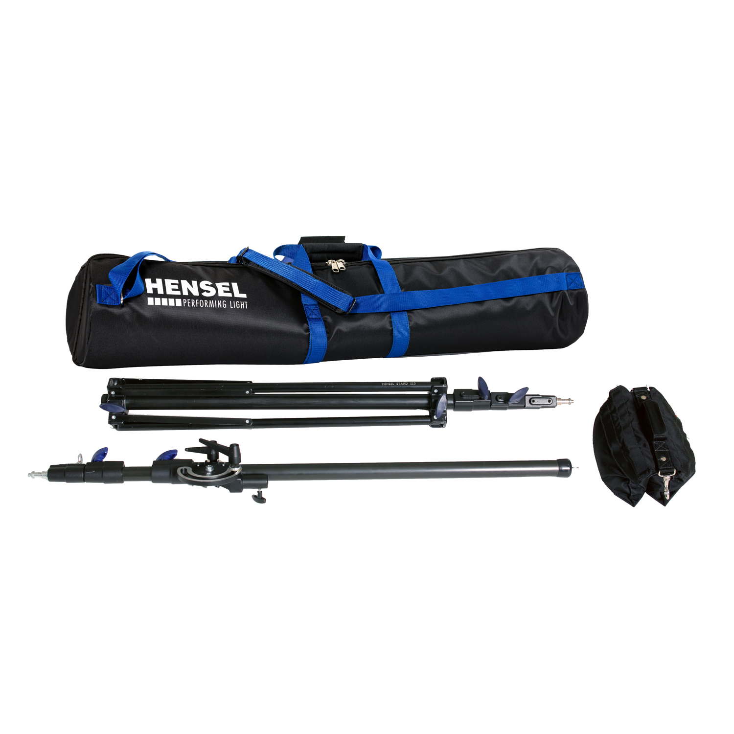 Dieses Kit besteht aus einem Hensel-Stativ VI (Art. 223), einem Galgenausleger 223 (Art. 800G223), einer Pivoting Clamp (Art. 9802100) und einem Sandsack (Art. 8000266), verpackt in der großen Stativtasche (Art. 3750).